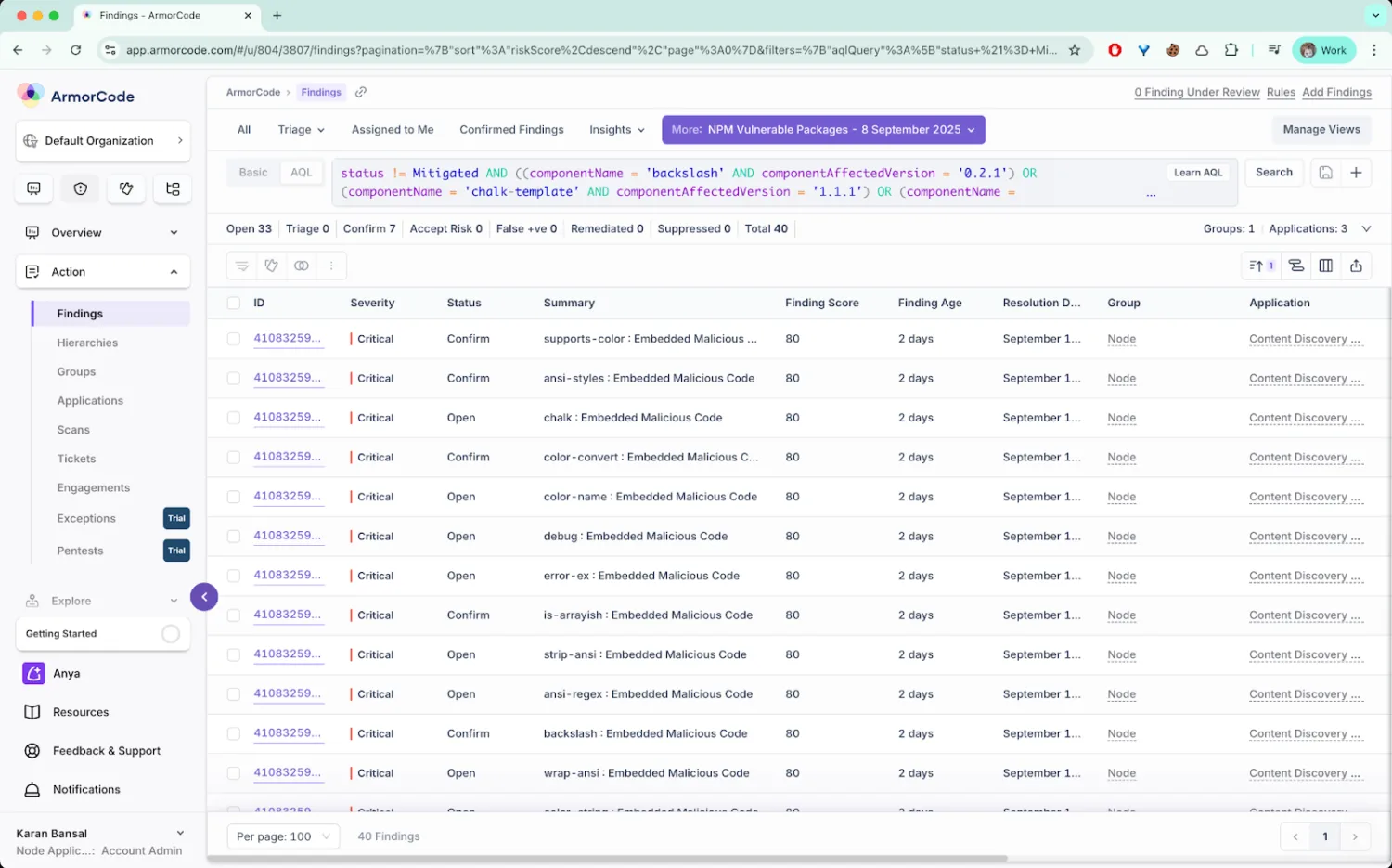 Go to the view “NPM Vulnerable Packages – 8 September 2025“ on the ArmorCode Findings page to identify all the unresolved findings in your system.